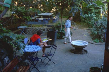 The packing was all complete and it was time to leave our shaded palace; all that remained was to pay. But where was Paul? Nowhere to be found and the time was fast approaching 10:20am which just left us 10min to get to the station! To make things easier Karen hurried out to change a 50 Euro note so that we could give exact change. She returned just as Paul did, so final rites were then completed and we departed in a sweaty rush for the train; too late! The next one? The timetable said none till 11:30am, but the station master said there would be one soon at 10:39am. How bizarre, for our watches agreed with the round station clock which pointed to '10 to 10'! We stared from the clock, to each other and back to the officer, expecting him to 'crack' in face of the blatant evidence, but the moment of truth was