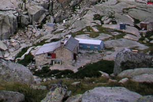 During the course of our conversation a storm had built and it was now pouring with rain; angry lightning whitened the night. It was not the hour of our intended bedtime, but we set up watch for a break in the weather. Of a sudden, the refuge visitors were astonished as the main entrance doors burst open and a figure appeared from the maelstrom outside, dripping wet, and bearing rucsac and headtorch. 'The pack mule' said the warden, grinning as his tousled partner produced bread and tomatoes from the sac. Our dinner suddenly leapt in value though the price was fixed. She seemed to be apologising for some of the shopping she hadn't got hold of; surely she would be forgiven!