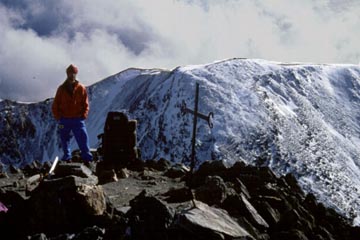 snow capped peaks and deep corries to the north, while to the south, blue-grey layered horizons stretched deep into Spain. The sky was clear save for thinning frontal cloud; only the biting wind marred a little, but it was far from touching core temperatures, and added colour to our cheeks.