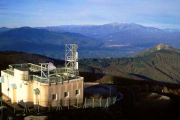 We reached the humble summit rocks to be greeted with hazy views and a stiff breeze which forbade casting of clouts. Spain lay peacefully to the south, but back west and 850m below, the Perthus highway was already crawling into action. Moving on, we passed a shallow col where the way took briefly to tarmac, then the trees thinned on the approach to Pic Neulos (1256m). This summit is rather spoiled by the transmitting station and towers which crown it; not forgetting the invisible